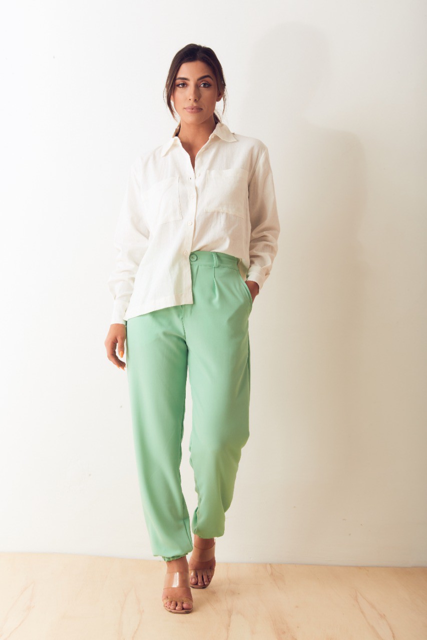 A Calça Com Elástico, by SMR Anzanello, é tudo o que você precisa para ser uma mulher elegante e moderna. Confeccionada em tecido com toque de crepe de cor verde e rosa. Calça cenoura com elástico na cintura e no punho com botão forrado. Para o dia a dia, ou para um evento a noite, você tem um look versátil para todos os momentos. Composição do tecido 94% poliéster e 06% elastano.