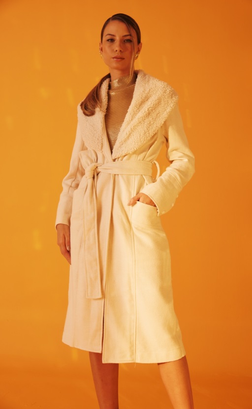 O Casaco Shell Off, by Isy, é tudo o que você precisa para ser uma mulher moderna. Confeccionada em tecido com toque de veludo, de cor off-white. Casaco longo com gola de pelúcia, botões no punho e acompanha faixa no mesmo tecido. Para o dia a dia, ou para um evento a noite você tem um look versátil para todos os momentos. Composição do tecido 100% algodão e forro 100% viscose.