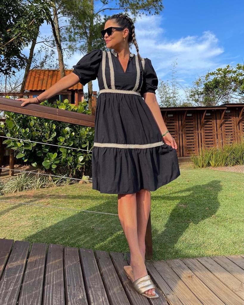 O Vestido Duas Marias, by Lalibela, é tudo o que você precisa para ser uma mulher elegante e moderna. Confeccionada em tecido com toque de algodão e em corte de alfaiataria, de cor preta. Vestido midi com bordados e mangas bufantes. Para o dia a dia, ou para um evento a noite, você tem um look versátil para todos os momentos. Composição do tecido 55% algodão e 45% poliéster.
