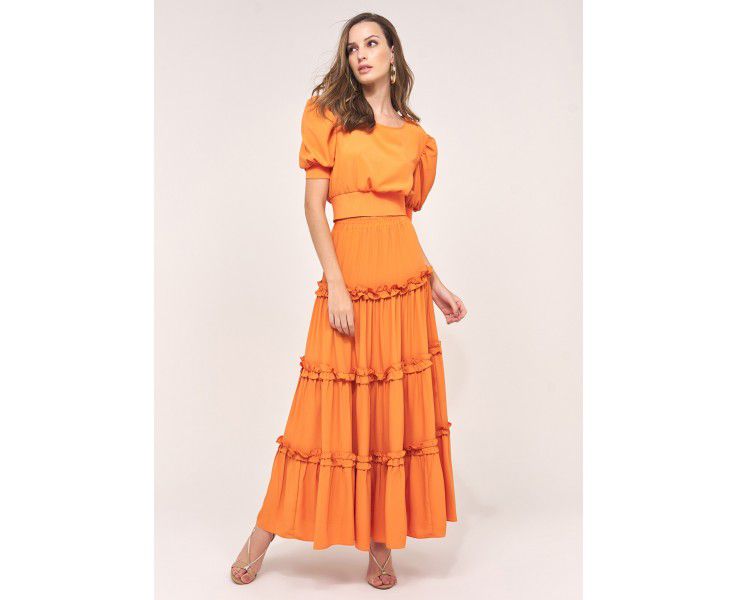 A saia Crepe Camadas Tangerina, by Lore, é tudo o que você precisa para ser uma mulher elegante e moderna. Confeccionada em tecido com toque de crepe e corte de alfaiataria, de cor tangerina. Saia longa em crepe lisa. Modelo possui camadas no comprimento, com recortes e mini babadinhos franzidos nos recortes. Tecido fluido e encorpado. Saia com cós em elástico largo. Modelagem para ser usada com cintura alta. Combine com croppeds, t-shirts e regatas com alça fina. Para deixar uma produção mais arrumada, use com uma camisa de botões mais larguinha que fica um charme. Para o dia a dia, ou para um evento a noite você tem um look versátil para todos os momentos. Composição do tecido 100% poliéster.